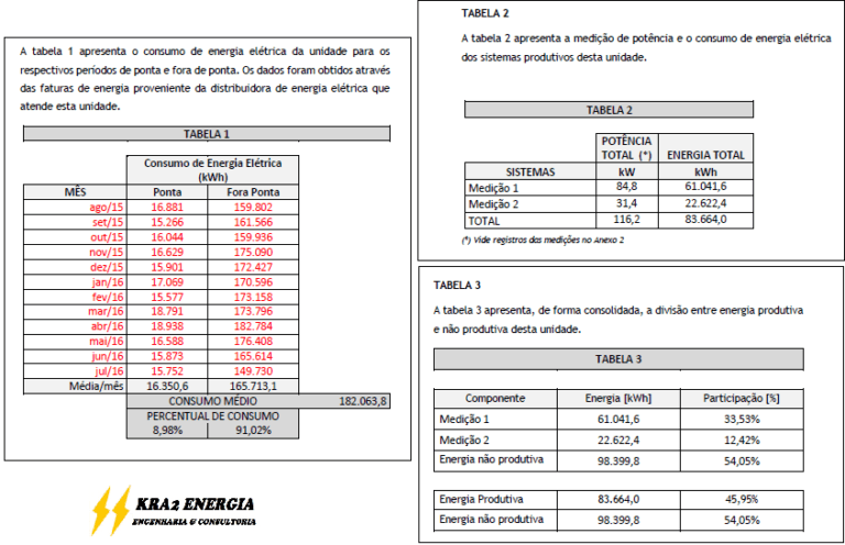 O Laudo Técnico é composto por um memorial de cálculo com elaboração das curvas médias de consumo e demanda, através das faturas de energia, medições de consumo nos locais de ocorrência e análises das cargas elétricas produtivas e não produtivas, entre outros componentes, para que possa ser calculado o índice técnico percentual de rateio de consumo.